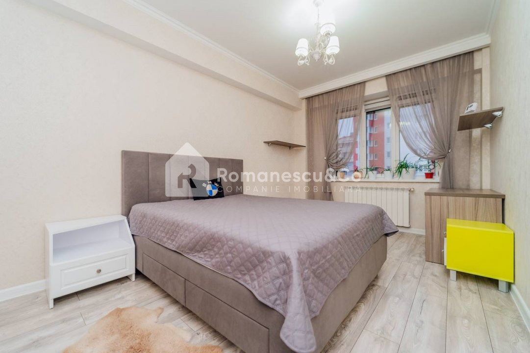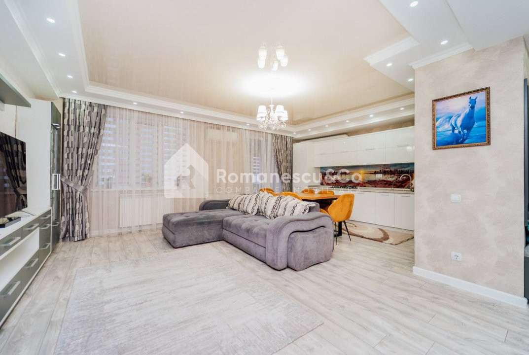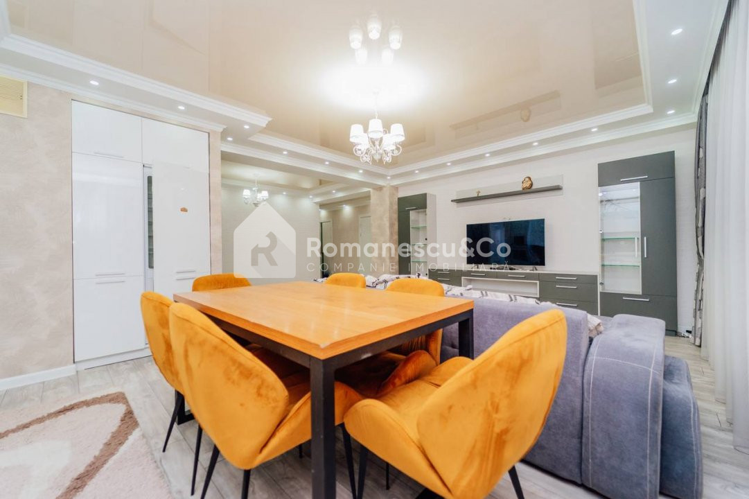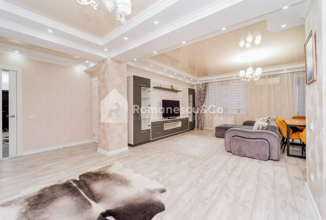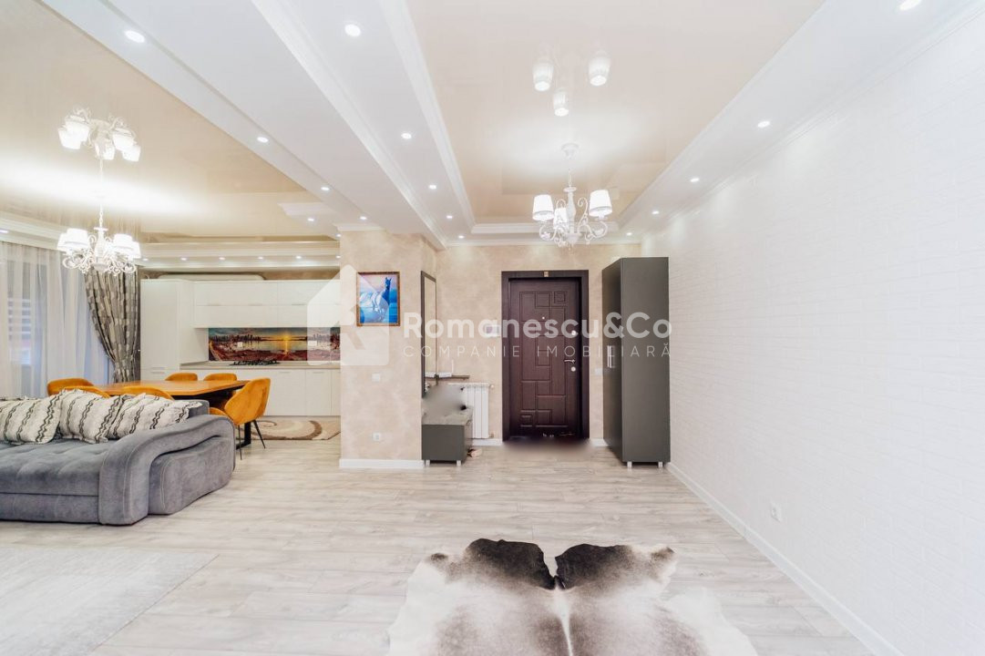 Se oferă spre închiriere un apartament modern, spațios, cu suprafața de 95,80 mp, situat la etajul 10 al unui bloc nou.