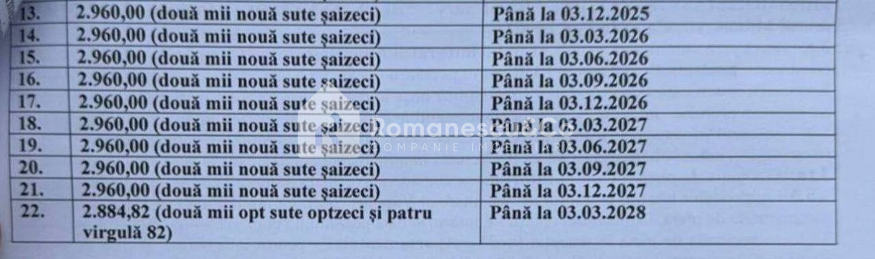 Posibilitatea achitării în rate suma de 29600 mii a cite 10 rate, trimestrial cate 2960 euro, urmatoarea rata 03.12.2025