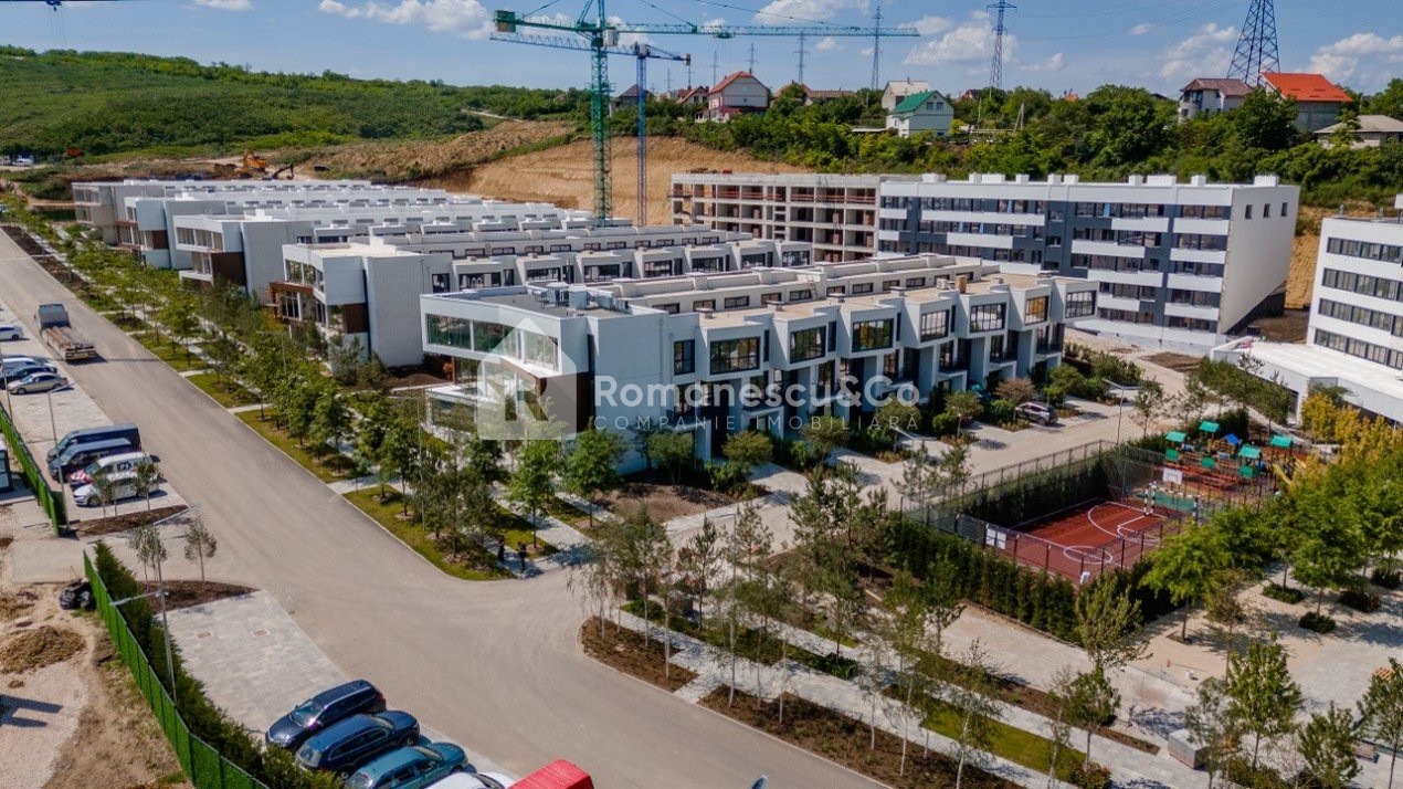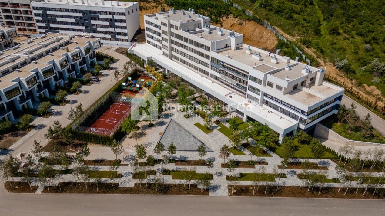 Curtea complexului amenajată cu diverse spații comerciale, gradiniță privată, multiple terenuri de joacă pentru copii, terenuri de sport pentru maturi, parc cu havuz și alee pietonală.