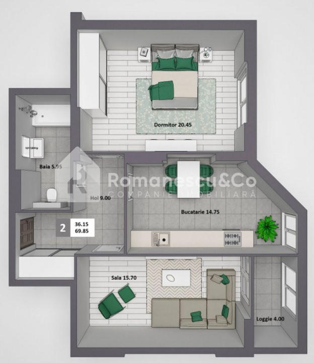 Apartamentul are o suprafață totală de 69 mp și este compartimentat eficient în: 2 dormitoare, living, bucătărie, bloc sanitar, antreu.