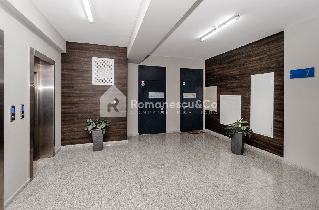 Scările sînt placate cu granit, iar cele 2 ascensoare rapide, silențioase, duc pînă la parcările subterane.