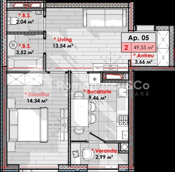 Apartamentul se extinde pe o suprafață de 49.55 mp și este compartimentat în 1 dormitor, bucătărie, antreu, 2 blocuri sanitare, 1 balcon.