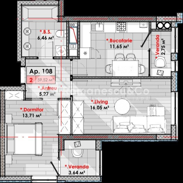 Apartamentul se extinde pe o suprafață de 59.52 mp și este compartimentat în 2 dormitoare separate, bucătărie, antreu, bloc sanitar, 2 balcone.