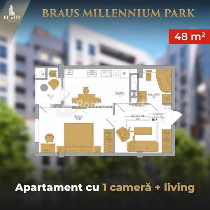 Spre vanzare apartament cu 1 cameră + living – Braus Millenium Park, Telecentru.