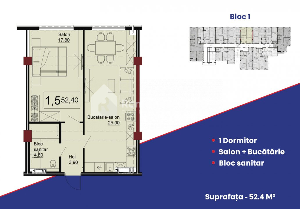 Locuința are o suprafață totală de 52,40 m² și este poziționată la etajul 7 din 12, oferind o compartimentare practică și spațioasă: 1 dormitor, bucătărie combinată cu living, bloc sanitar, hol.