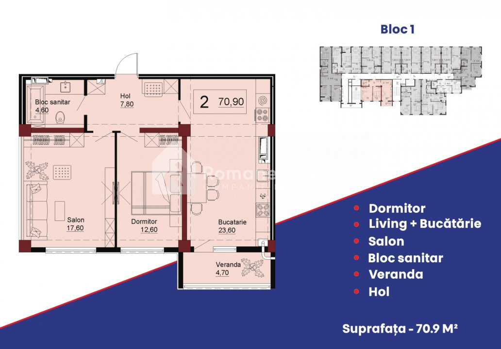 Locuința are o suprafață totală de 71,70 m² și este poziționată la etajul 7 din 12, oferind o compartimentare practică și spațioasă: 1 dormitor, bucătărie combinată cu living, bloc sanitar, hol.