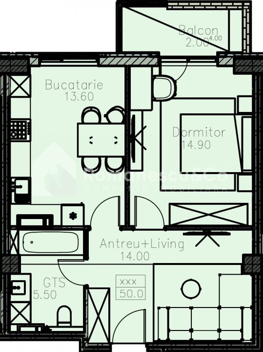 Apartamente cu 1 cameră între 41 m² și 66 m²;