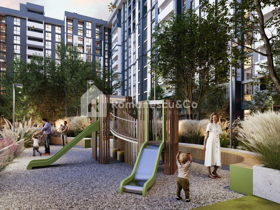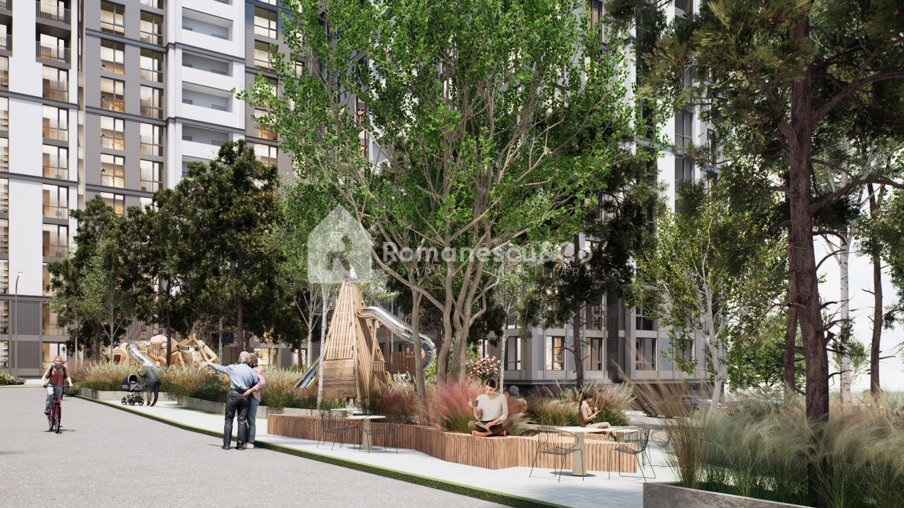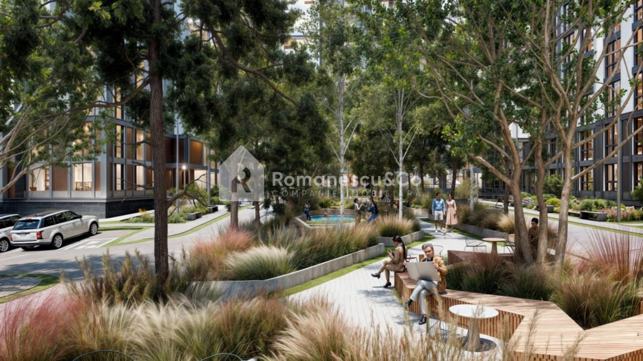 • Parc verde amplasat la colțul clădirii — perfect pentru relaxare
