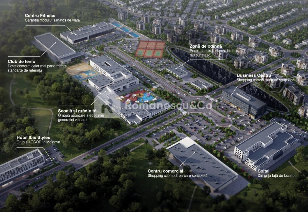 Complexul dispune de școală, grădiniță, spital și market pe teritoriu, creând condiții ideale pentru o viață confortabilă și sigură.